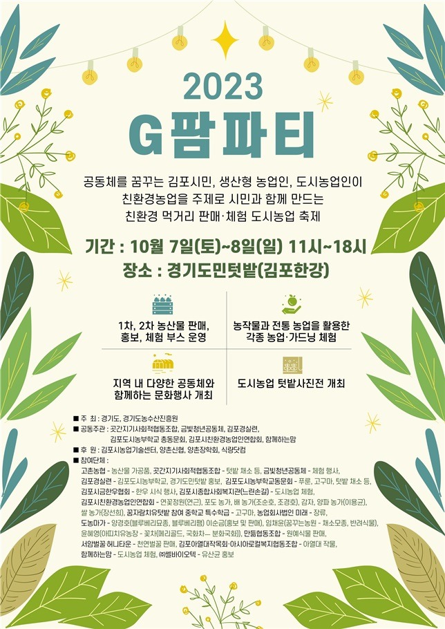 경기도와 경기도농수산진흥원은 7일과 8일 이틀간 오전 11시부터 오후 6시까지 김포시 장기동에 위치한 경기도민텃밭에서 2023 도시농업 공동체 활성화 추계 프로그램인 ‘G팜파티’를 개최한다.