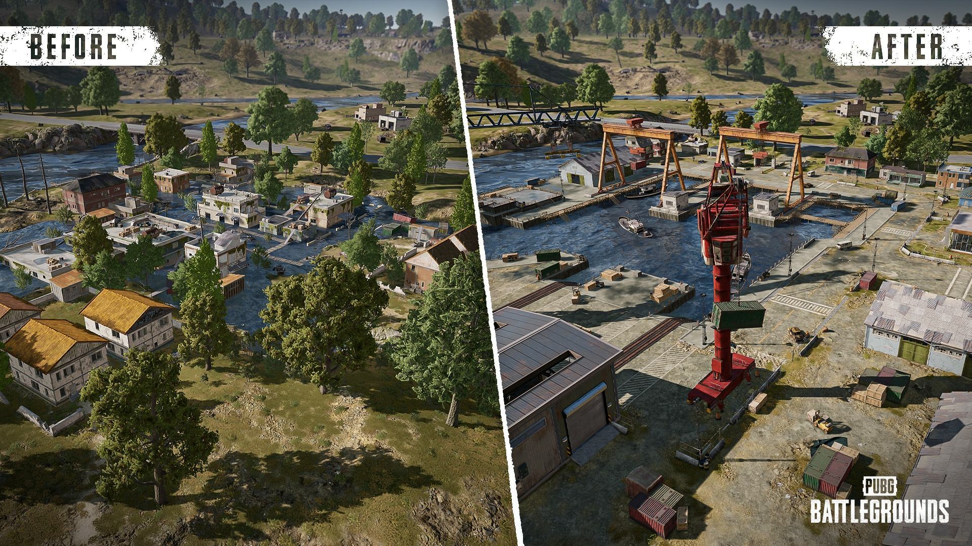 배틀그라운드의 가장 오래된 전장이자 상징적인 맵인 에란겔에 개선된 지형과 신규 기능을 선보였다. 맵 중앙에 인접해 있으나 이용자들이 자주 이용하지 않는 지역들의 전반적인 레이아웃을 개편했다. 천문 관측소 테마로 변경된 ‘스탈베르(Stalber)’에는 신규 건물과 파밍 지점을 추가하고 이용자들의 원활한 이동을 위해 주변 지형을 개선했다. ‘밀타(Mylta)’는 마을 중앙에 물줄기가 흐르고 옥수수밭이 있는 지역으로 재구성했다. 엄폐물이 부족했던 기존 해변가 지역에는 나무를 추가하고 전반적인 파밍 효율을 개선했다. ‘유적(Ruins)’과 ‘게오르고폴(Georgopol)’은 보다 매끄러운 플레이 흐름을 지원하기 위해 파밍 동선을 조정했다.