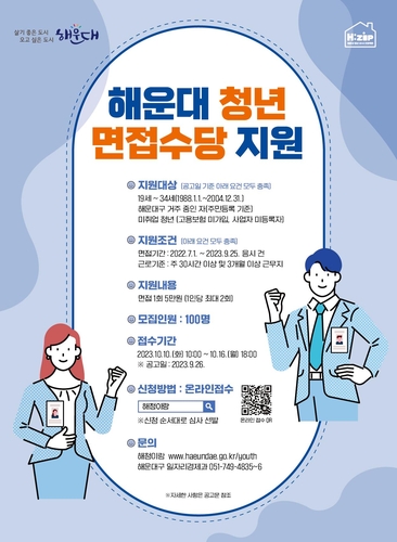 해운대 거주 19∼34세 미취업 청년 100명을 선발할 예정이다. 지난해 7월 1일부터 올해 9월 25일까지 일자리를 얻기 위해 면접에 응시한 경우 면접 1회에 5만 원, 최대 2회 10만 원을 지원한다.