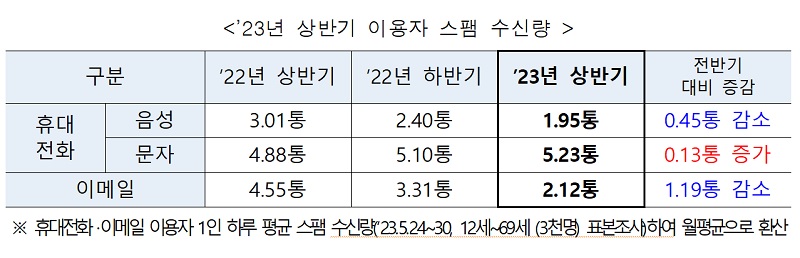 휴대전화를 통한 음성스팸과 이메일스팸 수신량은 각각 1.95통과 2.12통으로 작년 하반기 대비 감소했으나, 휴대전화 문자스팸 수신량은 5.23통으로 소폭 상승했다.