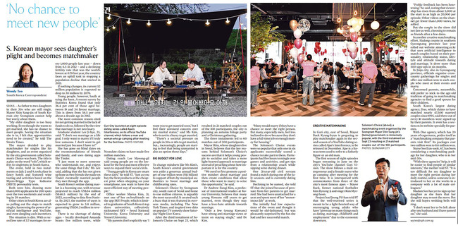 싱가포르 최대 일간지 스트레이츠 타임스 (The Strait Times) 에 지난 9 월 미혼 청춘남녀의 만남을 위해 마련한 성남시 ‘ 솔로몬 (SOLO MON) 의 선택 ’을 전면으로 다루는 특집기사가 실렸다.