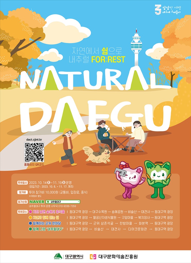 내추럴대구 투어 프로그램에 대한 내용은 대구문화예술진흥원 홈페이지( www.dgfca.or.kr ) 또는 삼삼한 대구여행 홈페이지( www.삼삼한대구여행.kr )에서 확인할 수 있으며, 10월 6일부터 내추럴대구 예약사이트를 통해 투어 신청이 가능하다.