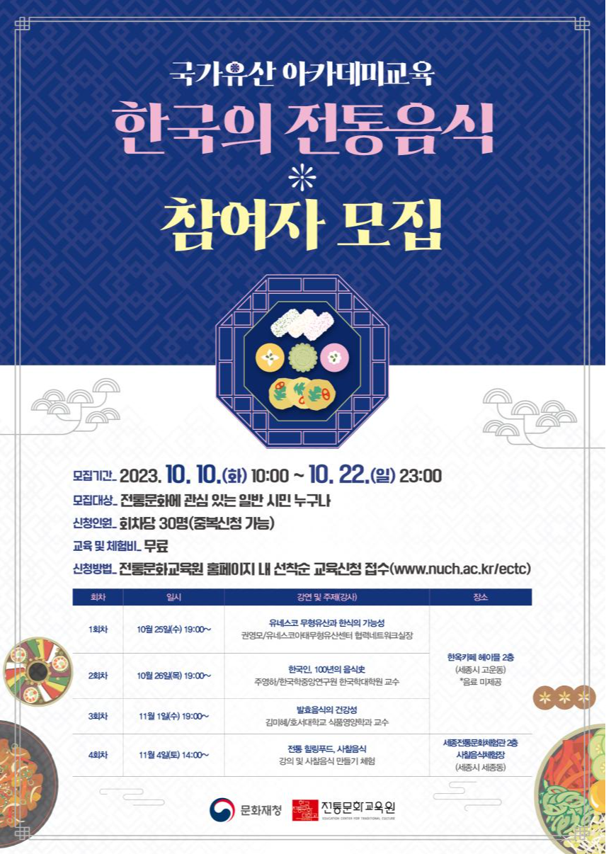 문화재청 한국전통문화대학교 전통문화교육원은 오는 10월 25일(수)부터 11월 4일(토)까지 총 4회에 걸쳐 2023년 「국가유산 아카데미교육 – 한국의 전통음식」 교육을 운영한다.