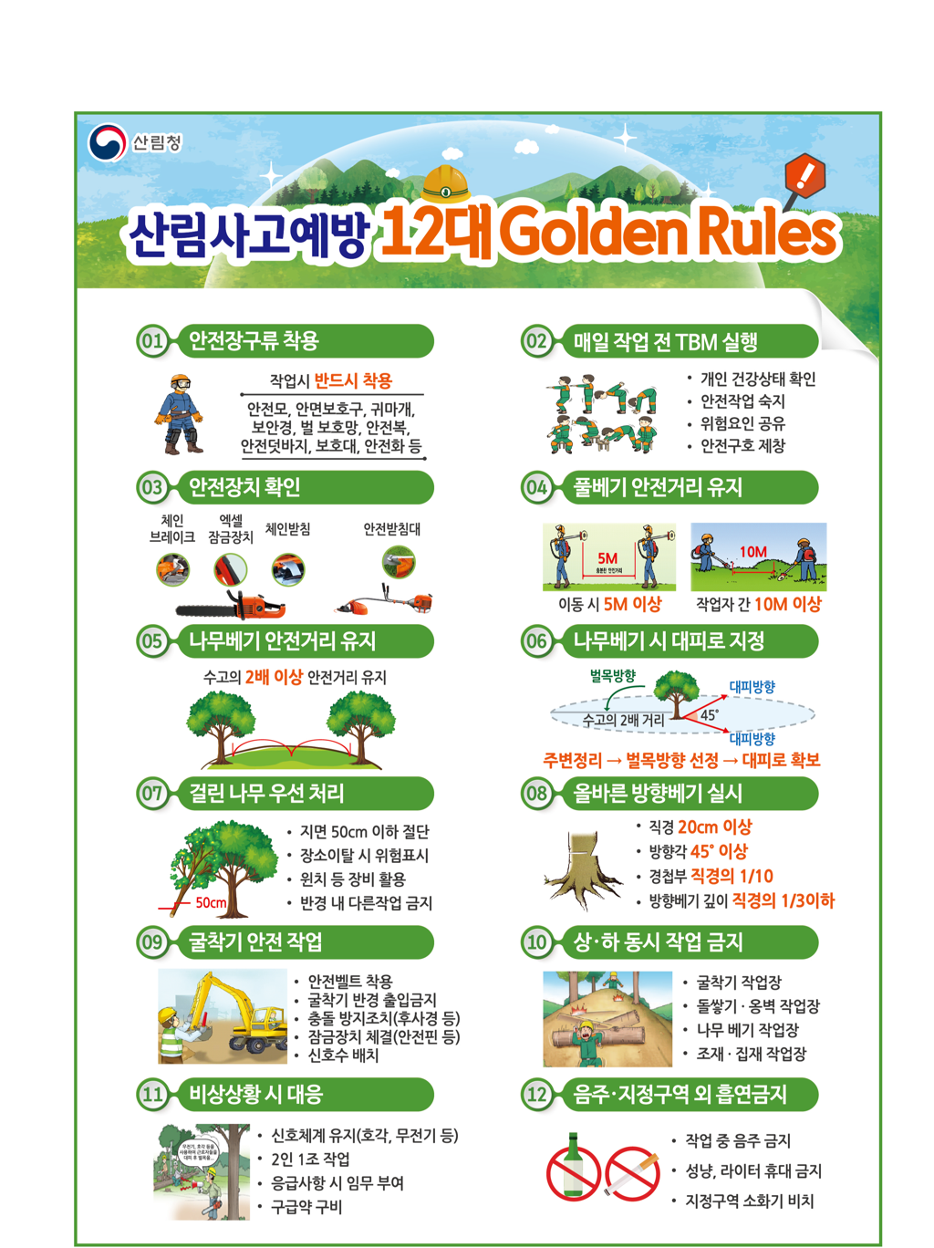 아울러, 기존 산림사업 안전관리 설명서를 안전사고가 자주 발생하는 고위험작업 중심으로 개정하고, 산림사업 시 반드시 지켜야 할 12대 안전 수칙(Golden Rules)을 그림 자료로 만들어 제공함으로써 산림사업 근로자가 안전사고 예방법을 쉽고 빠르게 이해할 수 있도록 하였다.