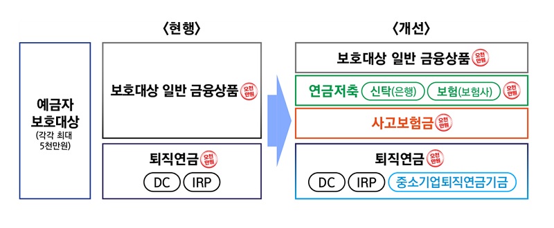 이번 개정안은 사회보장적 성격이 강한 연금저축(신탁·보험), 사고보험금, 중소기업퇴직연금기금 각각에 대해서도 일반 예금과 분리해 별도로 5000만 원의 예금보호한도를 적용하기로 했다.