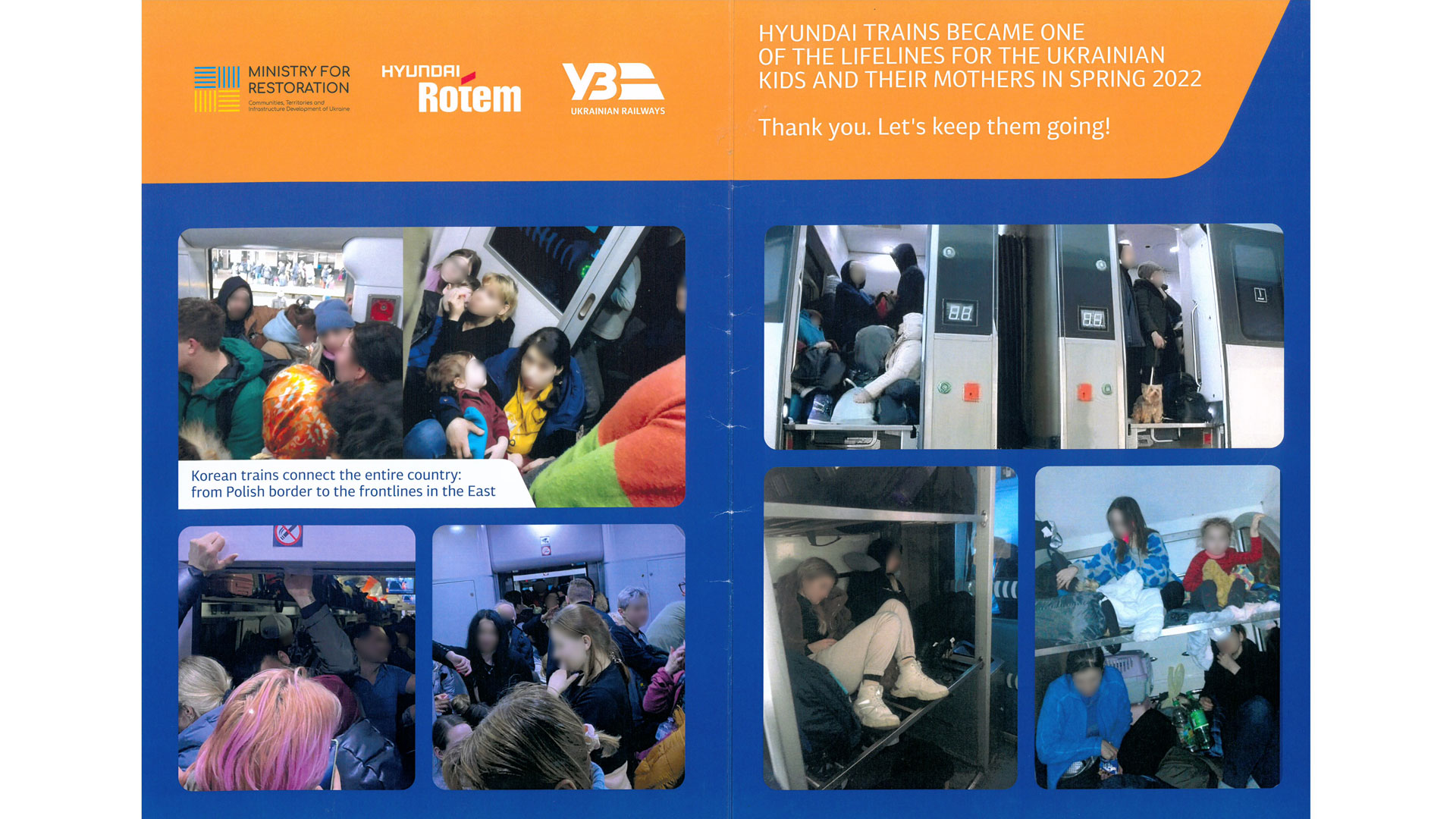 팸플릿 전반에는 현대로템이 납품한 현지 철도차량 안팎에서 포착된 가족, 연인 단위 피난민들의 사진 17장도 함께 수록됐다. 사진은 피난길에 오르고 있는 현지 분위기를 고스란히 담아내고 있다.