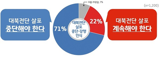 우선 응답자의 71%는 ‘대북전단 살포를 중단해야 한다’고 답했다. ‘대북전단 살포를 계속해야 한다’는 응답은 22%로 나타났다.