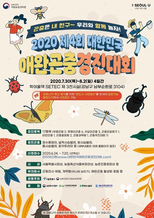 서울특별시와 농촌진흥청은 「2020 제4회 대한민국 애완곤충경진대회」를 7월 30일(목)부터 8월 2일(일)까지 총 4일 간 세텍(SETEC, 3호선 학여울역)에서 공동으로 개최한다고 밝혔다.