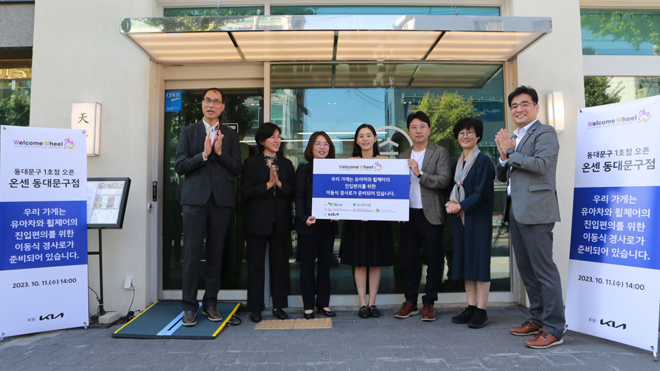 기아는 교통약자의 이동 편의 및 접근성 향상을 위한 ‘웰컴휠(Welcome wheel) 캠페인’을 진행하며 텐동전문점 ‘온센’(동대문구 소재)을 1호점으로 선정하고 이동식 경사로 전달식을 했다고 12일(목) 밝혔다.