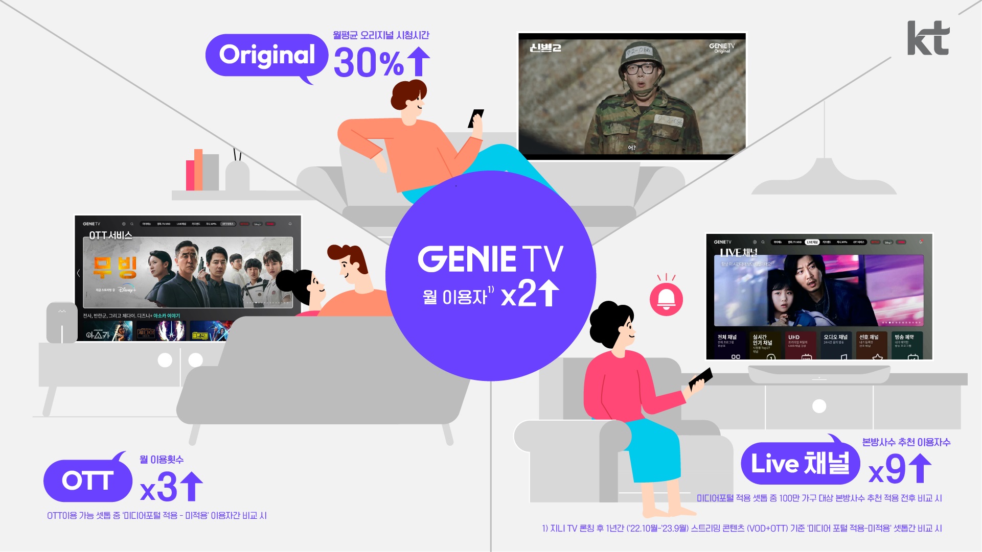 KT는 그간 <신병>, <남남>, <마당이 있는 집>, <행복 배틀> 등 다양한 장르의 오리지널을 제작해 자사 고객들에게 무료로 제공하고 있다. 지니 TV 오리지널 대표작 <신병>은 시즌1과 2를 종합해 지니 TV에서만 VOD뷰수가 1,230만에 달할 정도로 큰 사랑을 받았고, ENA에서 최근 종방한 <신병2>의 최고 시청률은 전국 유료방송가구 기준 3.57%(닐슨 코리아 기준)를 기록하며 월화 드라마 1위를 차지한바 있다.