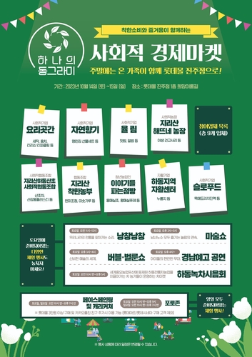 행사는 14일 오전 10시 30분부터 15일 오후 7시 30분까지 진행되며 ▲사회적경제기업 제품 판매 ▲구매 고객 대상 이벤트 ▲하동 차 마켓 '잎장'의 하동녹차시음회 ▲체험부스 운영 및 공연 등 다양한 프로그램으로 구성된다.