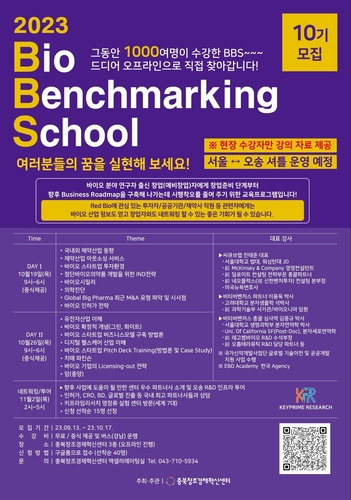 충청북도는 충북창조경제혁신센터 주관으로 바이오 창업 전문교육 과정(바이오창업아카데미)인 바이오 벤치마킹 스쿨(Bio Benchmarking School)과 메드텍 스쿨(Medtech School) 하반기 교육을 진행한다.