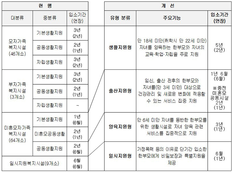 또한 시설 유형별로 기본 입소기간을 늘리고 입소기간 연장 사유 또한 폭넓게 인정하는 등 한부모가족의 자립 여건 형성을 위한 지원을 강화한다.