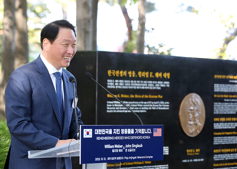 최 회장은 축사에서 “웨버 대령과 싱글러브 장군을 비롯한 6.25 참전용사들의 희생과 헌신은 우리에게 자유민주주의라는 씨앗을 선물했다”라며 “이로 인해 세계 최빈국에 속했던 우리나라가 반도체, 배터리 등 최첨단 산업에서 글로벌 시장을 주도할 수 있게 됐다”고 말했다.