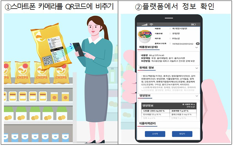 스마트폰으로 식품 포장지에 인쇄된 ‘QR코드’를 찍으면 제품명과 내용량(열량), 업소명, 소비기한(유통기한), 보관방법, 주의사항, 나트륨 함량 비교 등의 정보를 확인할 수 있다.