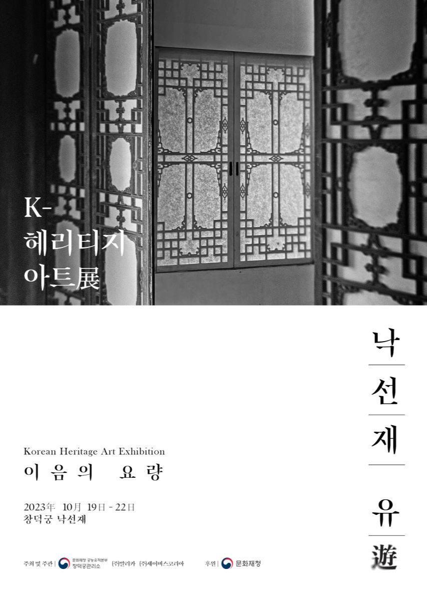 문화재청 궁능유적본부 창덕궁관리소는 10월 19일부터 22일까지 창덕궁 낙선재에서 문화재형 예비사회적기업인 말리카(대표 신동훈) 및 세이버스코리아(대표 정우성)와 함께 「낙선재유遊_이음의 요량」이라는 주제로 문화유산 예술행사‘K-헤리티지 아트전(Korean Heritage Art Exhibition)’을 개최한다.