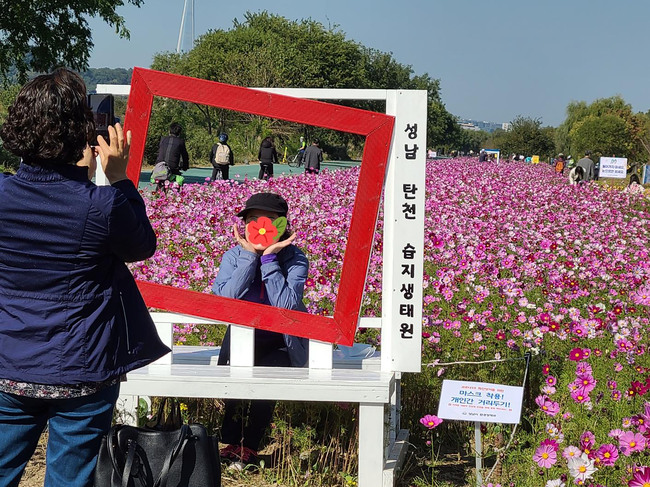성남시 수정구 태평동 탄천 태평습지생태원에 백만송이 코스모스길이 4,200㎡ 규모로 펼쳐져 눈길을 끈다.