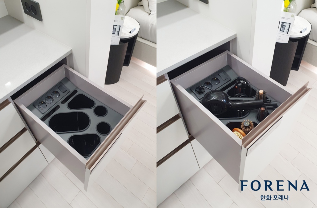 매일 사용하는 헤어 제품들의 정리 및 보관이 어렵다는 소비자 조사결과를 바탕으로 수납만으로도 정리가 가능하도록 디자인하였으며, 서랍 내장형 콘센트를 적용해 편의성을 더욱 높였다. 또한 전기를 사용하는 헤어 제품의 특성상 전선이 엉키거나 끼이는 문제를 고려해 별도의 공간을 마련하는 등 불편함을 해소하기 위한 디테일을 강화했다.