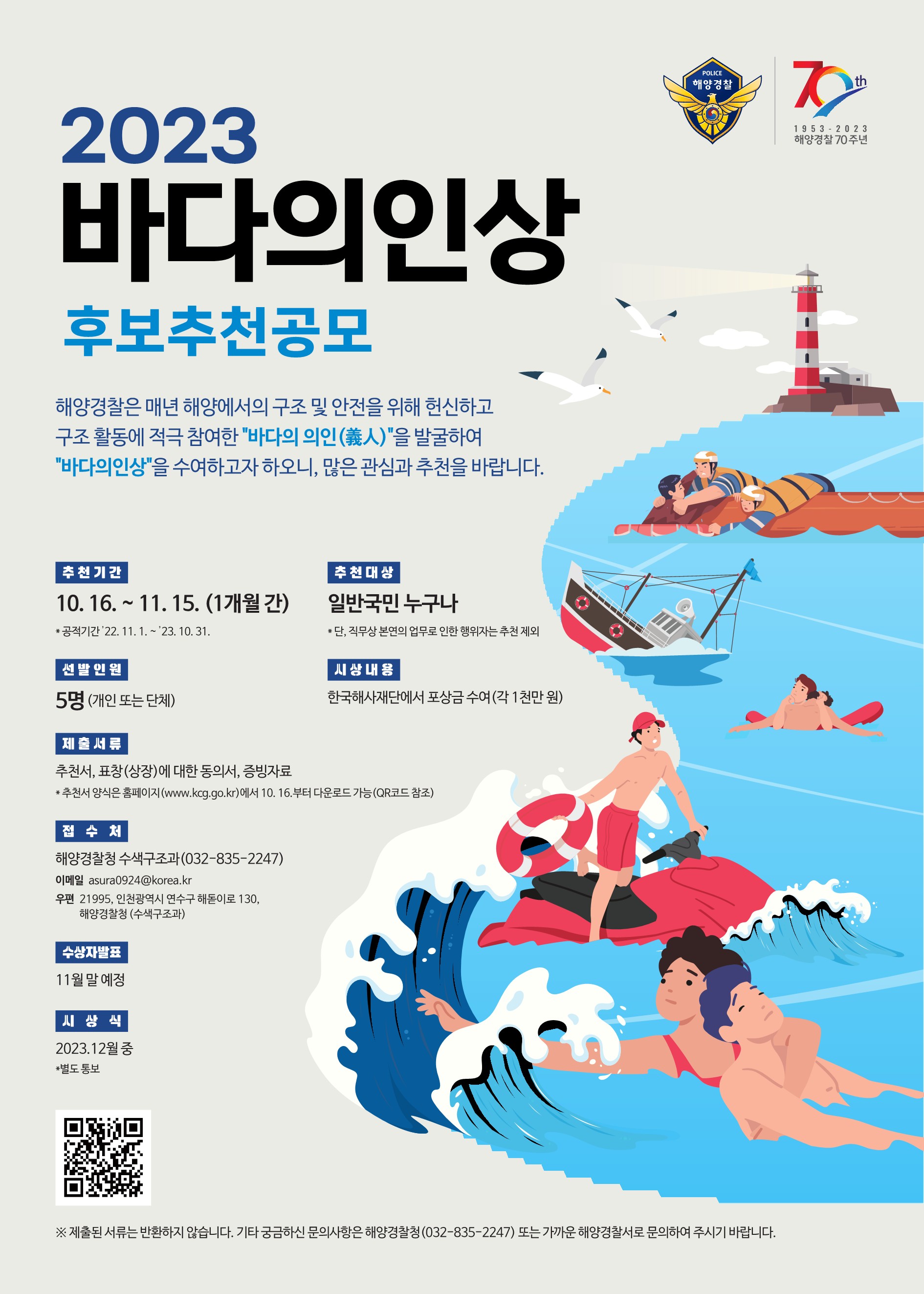 해양경찰청은 16일부터 오는 11월 15일까지 “2023년 바다 의인상”후보를 공모한다고 밝혔다.