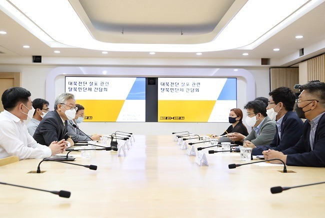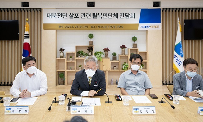 이재명 지사는 지난 24일 오후 경기도청 상황실에서 대북전단 살포와 관련해 탈북민단체와 간담회를 열고 경기도의 대응방안 및 대책에 대해 논의했다. 간담회에는 임용석 한꿈터 대표, 한태영 통일염원새터민연합회 대표, 최현준 통일미래연대 대표 등 도내 탈북민 단체·법인 대표들과 북한이탈주민 김광일․홍강철씨, 신명섭 평화협력국장 등이 함께 했다.