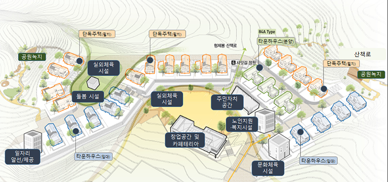 이에 은퇴자·청년층 등을 대상으로 단독·타운 하우스 등 수요자 맞춤형 주택을 분양·임대 등 다양한 방식으로 공급하고 돌봄·일자리·문화 등 생활서비스를 제공한다.