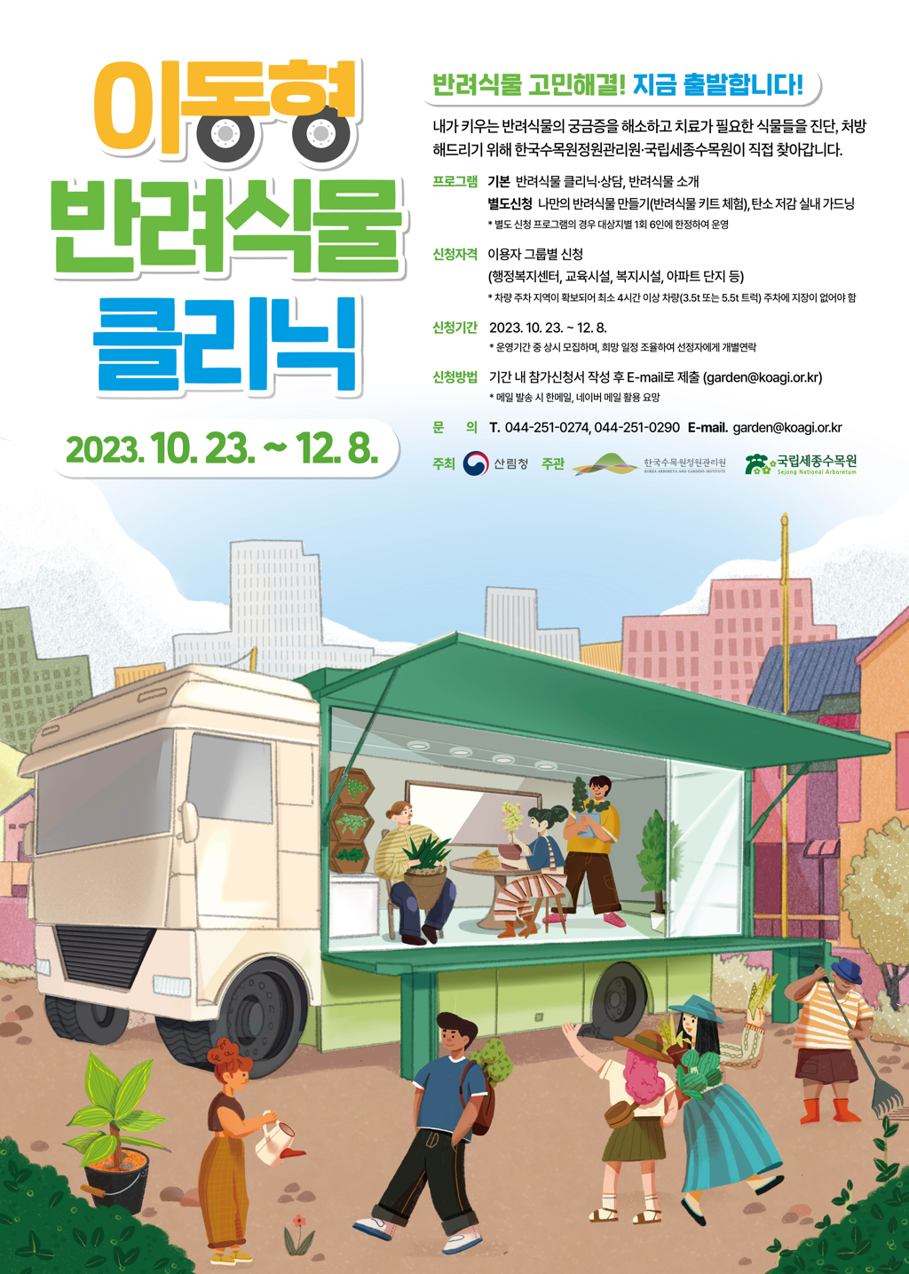 이동형 반려식물 클리닉은 산림청이 올해 처음 추진하는 사업으로 정원전문가가 특수 차량을 이용하여 아파트단지나 행정복지센터를 찾아가 반려식물에 대한 상담 및 분갈이, 병해충관리 등의 클리닉을 제공하는 대국민서비스로, 마을공동체나 아파트단지, 행복복지센터 등 일정 지역 단위로 진행된다.