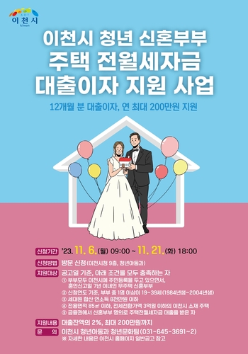 이천시는 청년 신혼부부의 주거비 부담을 완화해 안정적인 지역 정착을 지원하기 위해 주택전월세자금 대출이자를 지원한다고 밝혔다.