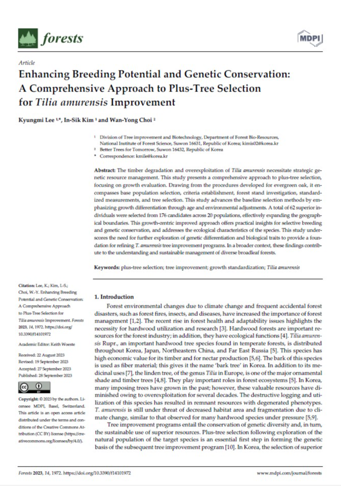 임목자원연구과 이경미 박사는 “피나무 선발에 활용된 방법론은 다른 활엽수종의 육성에도 활용이 가능하다는 측면에서 파급성이 높다”며, “지구온난화 대응을 위해 국내 활엽수종에 대한 육성 요구가 높은 상황에서,앞으로도 유망 활엽수종을 육성하기 위한 연구를 지속할 계획”이라고 밝혔다. 자세한 연구내용은 논문 원문(https://doi.org/10.3390/f14101972)에서 확인할 수 있다.