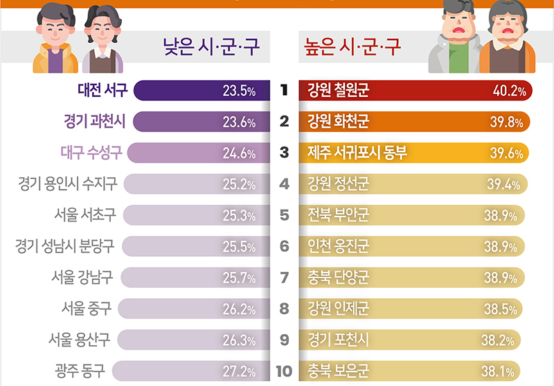 반면 강원 철원군(40.2%), 강원 화천군(39.8%), 제주 서귀포시 동부(39.6%) 순으로 높았는데 가장 낮은 대전 서구와 가장 높은 강원 철원군의 비만율 차이는 16.7%p였다.