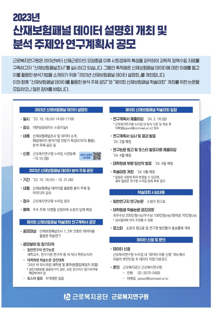 이번 설명회는 산재보험연구를 확대하고 정책 개선 아이디어를 수집하고자 개최했다. 산재보험패널 데이터 소개와 분석 방법에 대한 강의가 진행되었고, 이와 함께 산재보험패널 데이터를 활용한 분석 주제와 2024년 5월 개최할 예정인 산재보험패널 학술대회 연구계획서를 모집했다.