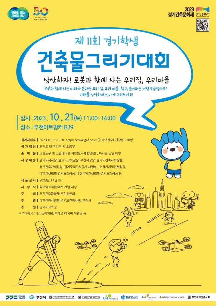 또한 최근 3년 동안 온라인으로 진행됐던 제11회 경기학생건축물그리기 대회는 부천아트벙커B39 행사장에서 ‘상상하자! 로봇과 함께 사는 우리집, 우리마을’이라는 주제로 야외행사가 진행될 예정이다.