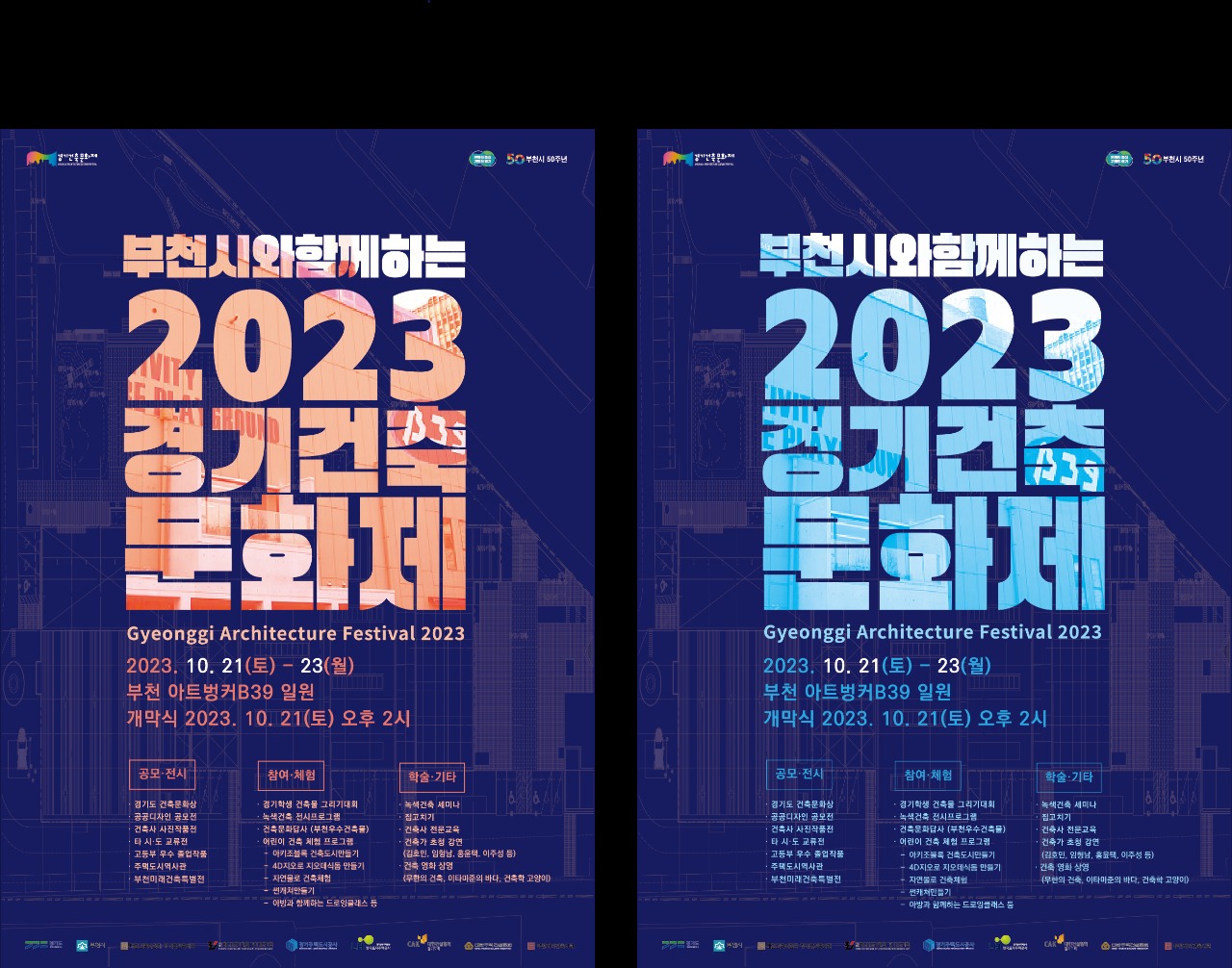 개막식과 시상식은 21일 부천아트벙커B39 야외무대에서 열리며 경기도건축문화상, 공공디자인공모전, 건축사 사진 작품전 수상작과 부천미래건축특별전, 고등부 우수 작품전 등 작품전시회는 21일부터 부천아트벙커B39 전시관에서 진행된다.