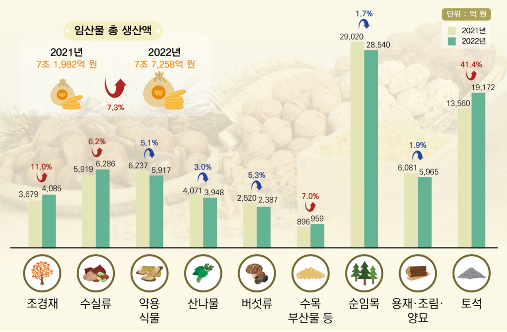 조사 결과, 2022년 임산물 생산액은 건설 경기 호전에 따른 토석 채취량 및 생산액 증가로 전년 대비 7.3% 증가한 것으로 나타났다. 단기소득 임산물은 조경재(11.0%)와 수실(6.2%) 생산액이 증가하여 약용식물(△5.1%), 산나물(△3.0%), 버섯(△5.3%) 생산액 감소에도 불구하고 전년 대비 260억 원(1.1%)이 증가한 것으로 조사되었다.
