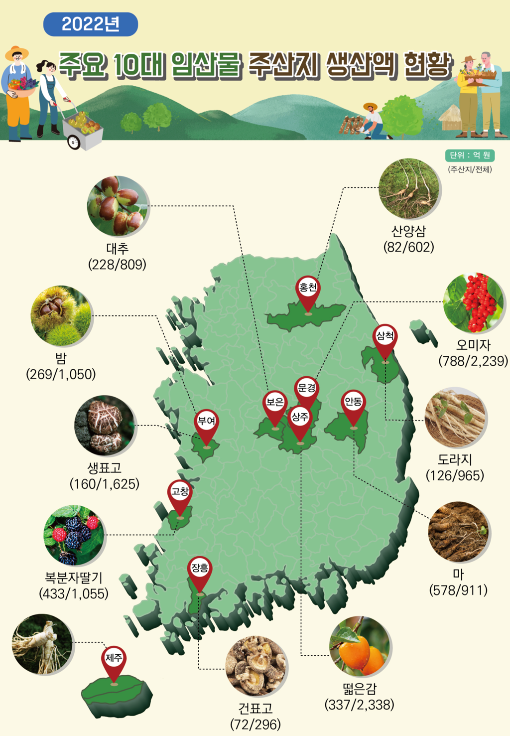 지역별 임산물 생산액은 경상북도가 1조 3,464억 원으로 전년에 이어 가장 높았고, 경상남도 1조 2,057억 원, 강원도 1조 1,477억 원 순으로 나타났다.
