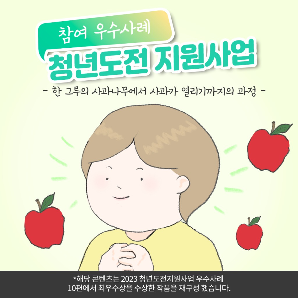 청년도전지원사업 우수사례 공모전에서 수상한 이○○(남) 씨는 “밀착 상담과 목소리 훈련을 통해 자신감을 회복한 게 큰 도움이 되었으며, 공기업 인턴에 합격하는 등 변화의 계기를 마련할 수 있었다”고 참여 소감을 밝혔다.