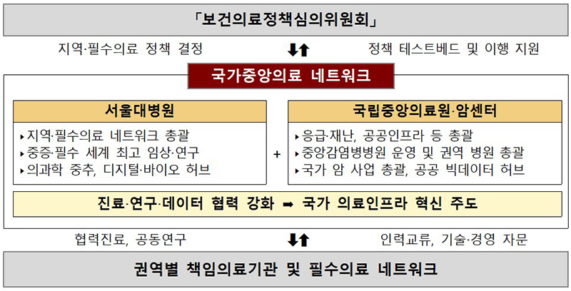 특히 서울대병원-국립중앙의료원·암센터를 국가중앙의료 네트워크로 연결해 상호발전을 도모하고, 지역의 중증 최종치료 역량 강화 등을 위해 국가중앙병원 역할을 대폭 강화한다.