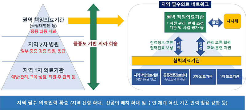 특히 지역 내 필수의료 협력 네트워크를 강화하는데, 먼저 지역의 병·의원이 필수의료 제공에 전념할 수 있도록 지역 병·의원의 역할을 정립하고 이에 대한 지원을 강화하기로 했다.