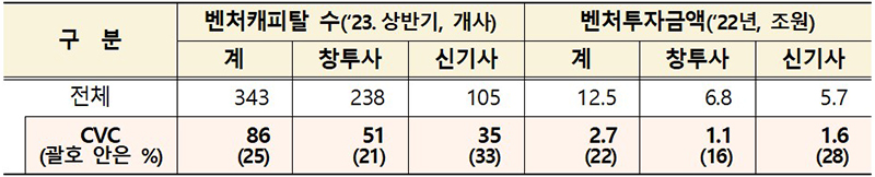 구체적으로 창투사 CVC가 1조 1000억 원을 투자했고 신기사 CVC의 투자는 1조 6000억 원 내외인 것으로 추정되는데, 이는 지난해 전체 벤처투자액 12조 5000억 원의 22% 수준이다.