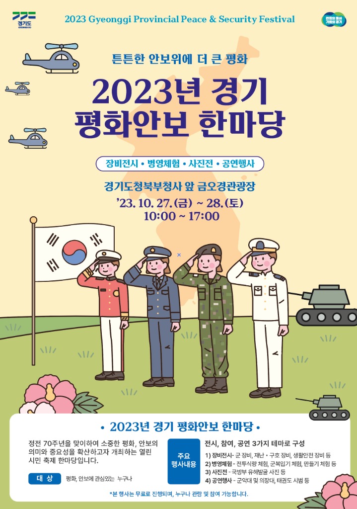 이순구 경기도 비상기획관은 “이번 행사를 통해 도민들과 함께 평화와 안보의 가치를 재조명하고, 모두에게 평화와 안보의 중요성을 일깨우는 기회가 될 것으로 기대한다”며 “평화와 안보에 관심이 있는 도민들의 많은 관심과 참여를 부탁드린다”고 말했다.