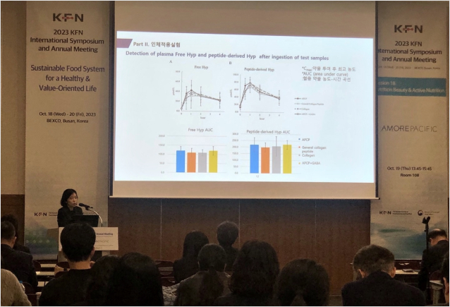 ▲아모레퍼시픽 R&I센터 채민정 박사는 'AP 콜라겐 펩타이드 섭취에 의한 Gly-Pro-Hyp의 체계적 흡수 및 GPH의 과산화수소(H2O2)에 의한 섬유아세포의 노화 완화 효능(Oral ingestion of AP collagen peptides leads to systemic absorption of Gly-Pro-Hyp, Alleviating H2O2-Induced Dermal Fibroblast Aging)을 주제로 발표했다. 관련 연구를 통해 'AP 콜라겐 효소분해 펩타이드'의 체내 흡수율 증가를 확인했으며, 해당 원료는 아모레퍼시픽 바이탈뷰티 브랜드에서 출시하는 제품에 적용할 계획이다.