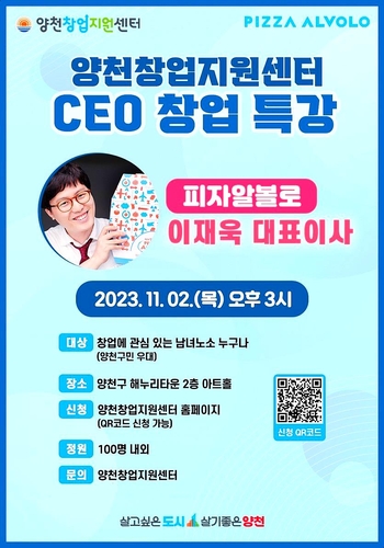 양천구는 지역 창업 활성화를 위해 다음 달 2일 해누리타운 아트홀에서 양천구에 본사를 둔 유명 외식 기업인 '피자 알볼로'의 이재욱 대표를 초청해 창업에 관심 있는 시민 100여 명을 대상으로 'CEO 창업특강'을 개최한다고 밝혔다.