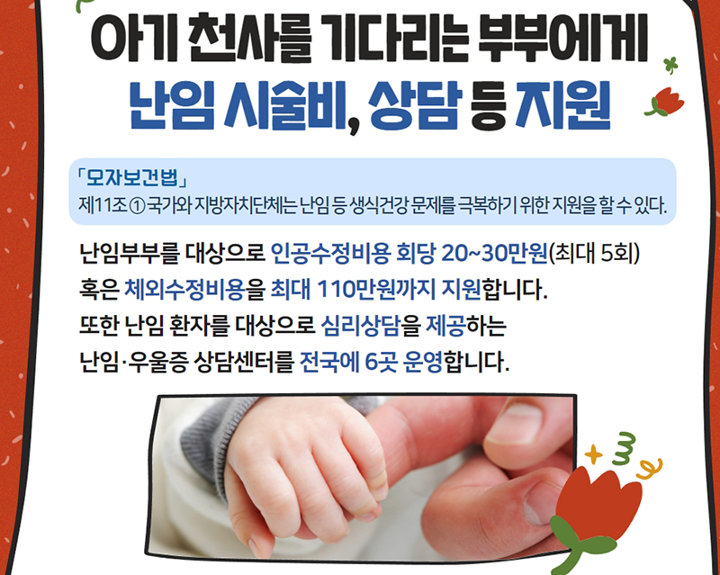 국가나 지방자치단체는 ‘모자보건법’에 따라 난임 극복을 위한 다양한 지원 사업을 할 수 있는데, 대표적으로 ‘난임 시술비 지원 사업’이 있다.