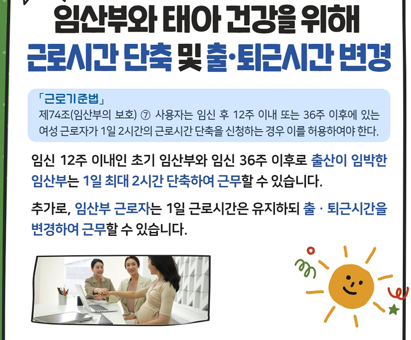 이에 임신 12주 이내인 초기 임신부와 임신 36주 이후로 출산이 임박한 임신부는 근로 시간을 1일 최대 2시간 단축해 근무할 수 있다.