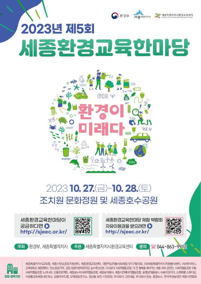 세종시민 모두가 환경문제를 인식하고 시민 차원의 실천적 행동을 다짐하는 ‘2023년 제5회 세종환경교육한마당’이 오는 27일 조치원문화정원과 28일 세종호수공원 일대에서 열린다.