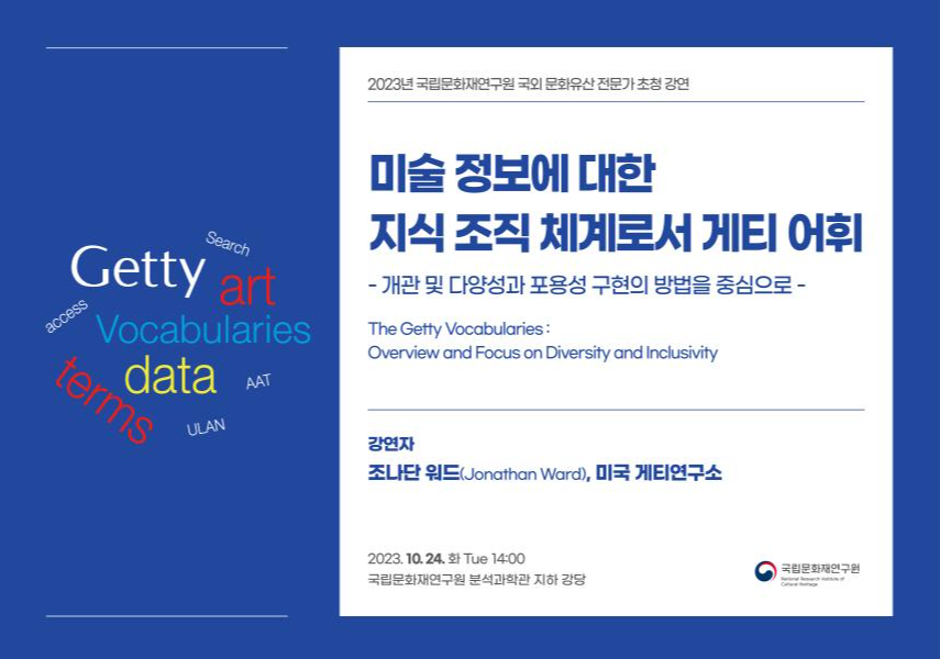 문화재청 국립문화재연구원(이하 연구원)은 24일 오후 2시 국립문화재연구원(대전 유성구) 분석과학관 강당에서 디지털 미술사 분야의 세계적 전문가인 미국 게티연구소 편집자를 초빙해 「미술 정보에 대한 지식조직체계(KOS)로서 ‘게티 어휘’: 개관 및 다양성과 포용성 구현의 방법을 중심으로」란 주제의 강연을 개최한다.