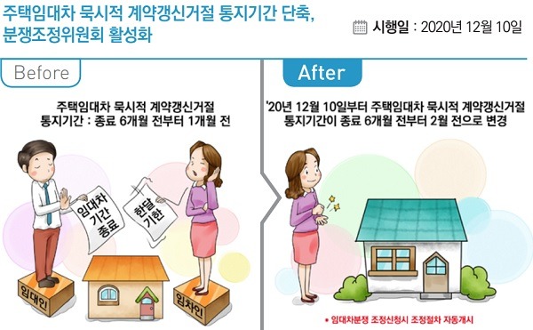 주택임대차 묵시적 계약갱신 거절 기간은 12월 10일을 기해 종료 6~1개월 전에서 종료 6~2개월 전으로 변경된다. 세입자에게 계약 만기 두달 전에 계약 해지 또는 임대료 인상 등을 통보하지 않았다면 임대차 계약은 그대로 갱신되는 것으로 간주한다.