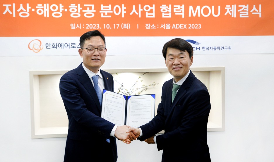 한화에어로스페이스는 국내 최대 항공우주·방위산업 전시회인 '서울 아덱스(ADEX) 2023'에서 한국자동차연구원과 '지상·해양·항공 사업의 상호 협력체계 구축을 위한 양해각서(MOU)'를 체결했다고 23일 밝혔다.