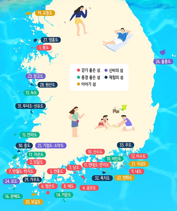 행정안전부가 걷기 좋은 섬, 풍경 좋은 섬, 이야기 섬, 신비의 섬, 체험의 섬 등 5가지 주제로 분류한 ‘2020년 휴가철 찾아가고 싶은 33섬’을 선정·발표했다.
