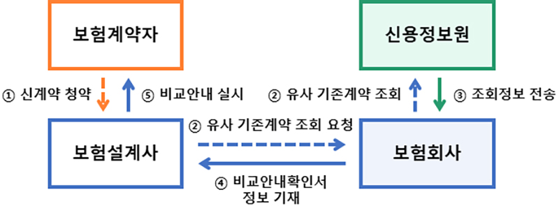 우선 신용정보원은 보험회사의 요청에 따라 보험계약자의 기존 계약정보를 확인해 새로운 계약과 보장내용이 유사한 기존계약 현황 및 세부 계약정보 등을 보험회사에 전송한다.