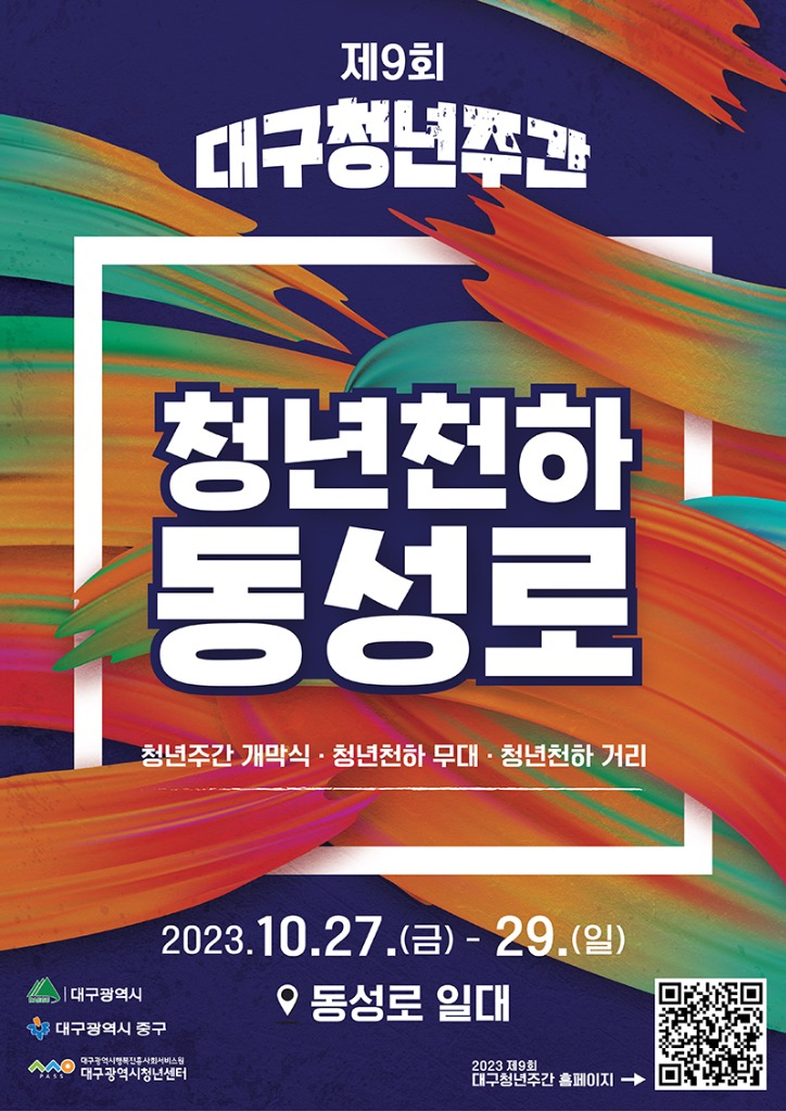 대구시와 대구시청년센터는 ‘2023 대구청년주간’ 행사를 10월 27일(금)부터 29일(일)까지 3일간 동성로 일대에서 ‘청년천하 동성로’라는 슬로건으로 청년과 시민이 함께 즐길 수 있는 축제로 개최한다.